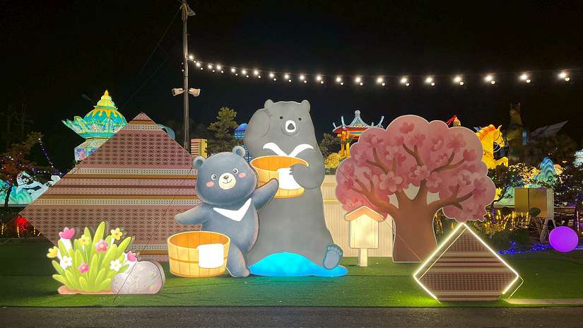 光舞豐年燈區中的「山林派對」與「星空野營」區域,是燈區中最可愛、最好拍的主題區域。由原民處IP原鄉動物大型氣模燈組與今年新推出的6大原鄉主題燈箱式拍照場景,搭配星空野營區的篝火意象與滿佈的金黃稻穗燈串,營造原鄉山林夜晚的溫暖氛圍,適合親子拍照與情侶約會。 特別是山林派對區,亦將南投原鄉的產業特色融入燈組設計。