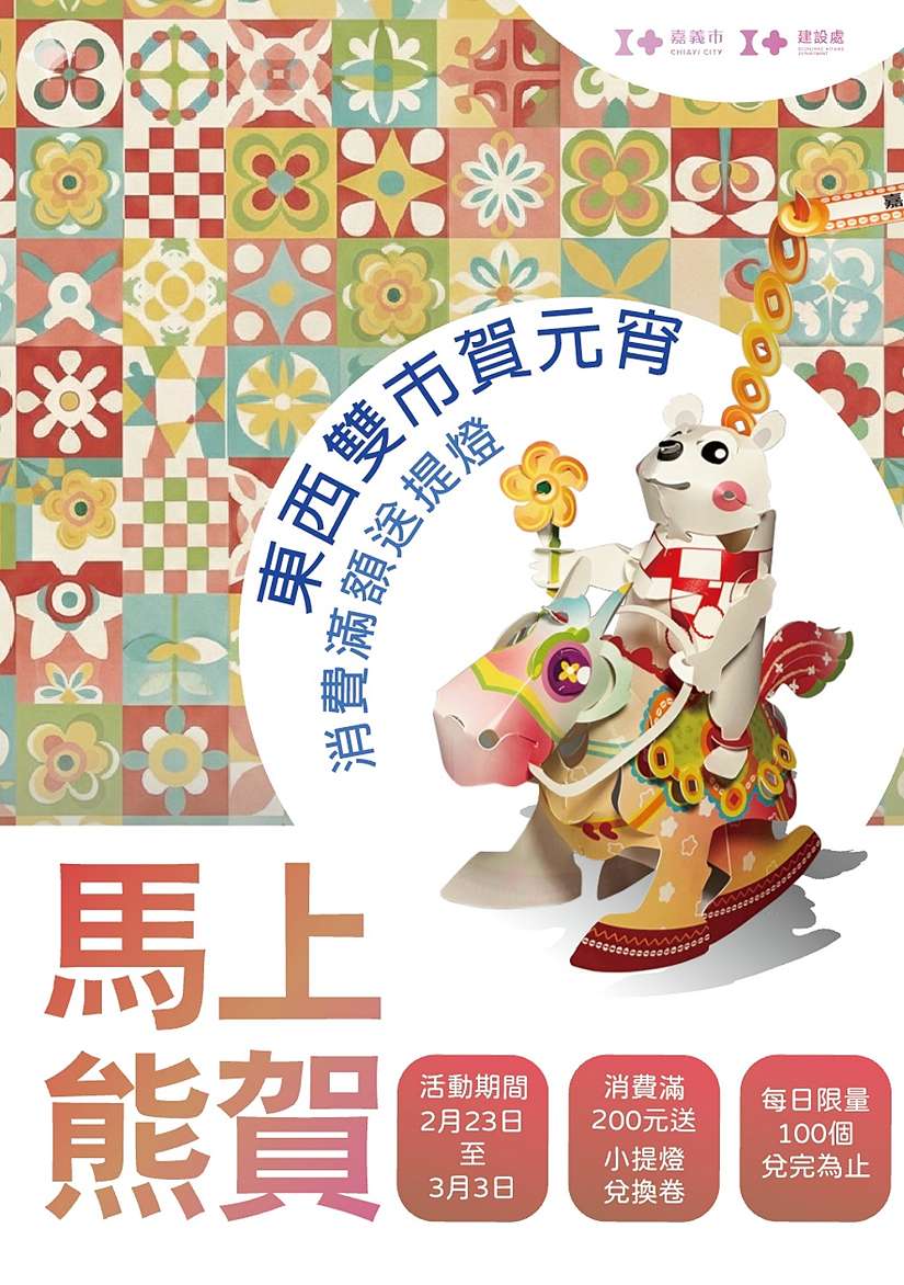 嘉義市政府也強調,「振興商圈夜市券」可於嘉義市轄內多間店家使用,包含商圈店舖、夜市攤商、市場、攤集場及各類餐飲、零售、旅宿與服務業,消費選擇豐富、使用便利,讓振興效益真正深入在地,帶動整體商圈與夜市買氣。2月23日起於東市場或西市場單次購買滿額200元,即可獲得指定店家贈送小提燈兌換券1張,單次最多兌換5張小提燈兌換券,持小提燈兌換券於3月3日前,在東市場或西市場兑換處兌換「馬上熊賀」小提燈,每日限量100個,數量有限,兑完為止。