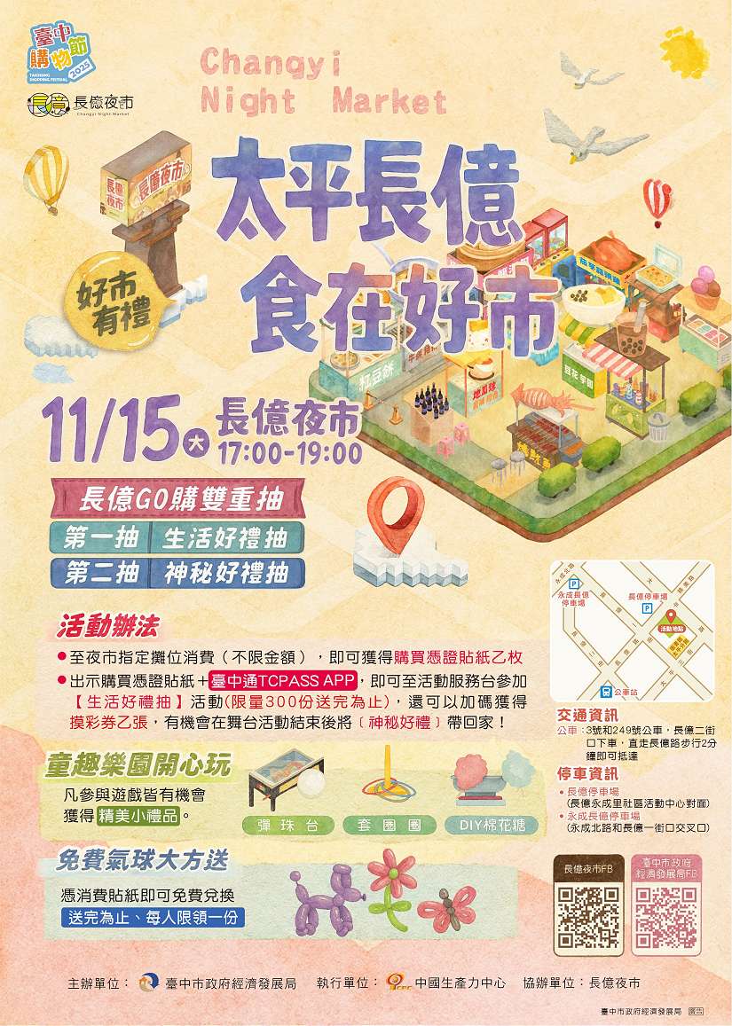 經發局補充,最後登場的是結合2025台中購物節抽獎的「好市有禮─太平長億 食在好市」嘉年華活動,於11月15日到太平長億夜市消費,不限金額即可獲得消費憑證貼紙1枚,憑貼紙並出示台中通TCPASS APP購物節的發票紀錄畫面,就可以參加生活好禮抽獎與神秘好禮摸彩活動,超過300份獎項等您拿,還有機會將50吋4K電視帶回家!現場同樣有免費DIY棉花糖、彈珠台和套圈圈等童玩遊戲,帶大家重溫童年懷舊情懷,闖關成功還能獲得精美小禮物一份!