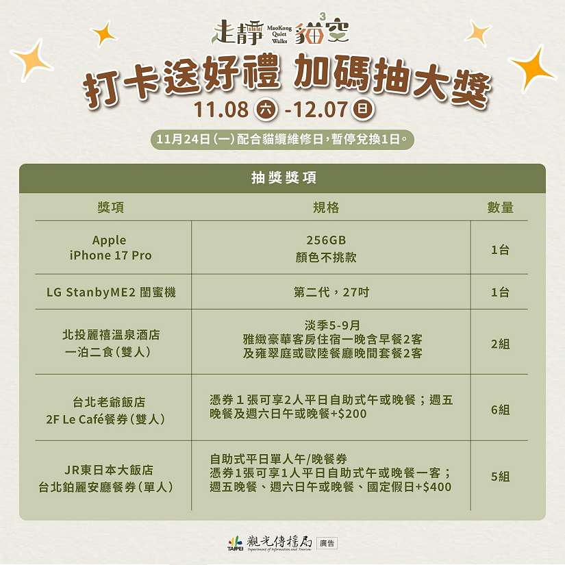 此外,完成打卡任務後,再追蹤「Humans of Taipei 我是台北人」FB粉絲專頁,即可現場登錄資料參加抽獎,獎項包含iPhone 17 Pro、LG StanbyME 2閨蜜機、北投麗禧溫泉雙人住宿券等總價值達15萬元。一趟旅遊就能收穫豐富回憶與帶回多重好禮。