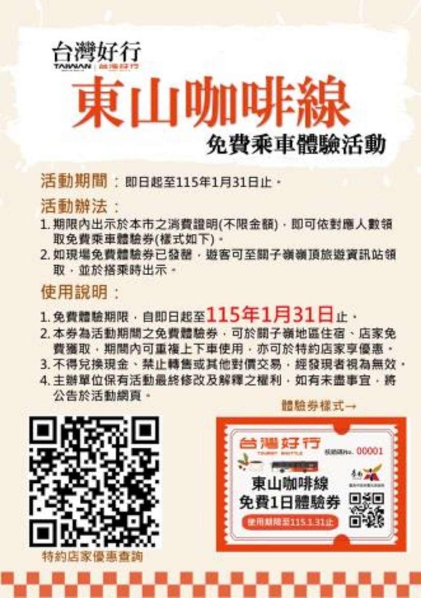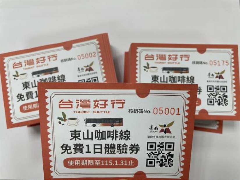 為邀請遊客深入體驗台南山區的咖啡文化、自然生態與溫泉魅力,臺南市政府觀光旅遊局推出台灣好行「東山咖啡線」一日免費搭乘體驗券,遊客本周六起入住關子嶺地區旅宿,或至關子嶺地區特約店家消費即可免費索取,使用期限至115年1月31日為止,憑券輕鬆搭乘東山咖啡線玩遍咖啡園、農莊、美食與景點。此外,東山咖啡線更串聯沿線店家共同推出餐飲折扣、消費贈品及泡湯優惠,邀請旅客規劃2天1夜行程,從關子嶺泡湯暖身,到東山體驗咖啡香氣與山城風景,一次享受台南秋冬最療癒的旅遊體驗。