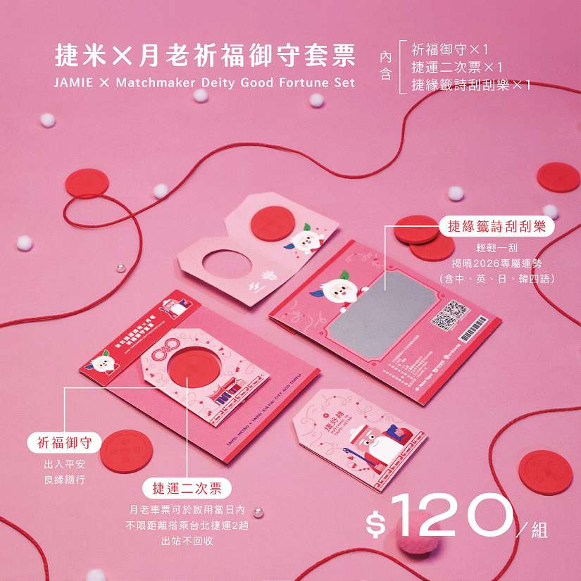 每組套票售價新臺幣120元,包含祈福御守1個、捷運二次票1枚及捷緣籤詩刮刮樂1張。御守設計結合以求姻緣聞名的「台北霞海城隍廟」、捷運列車意象,以及月老「捷米」獻上祝福;御守中央則是紅色圓形的捷運二次票,象徵緣分圓滿、好事成雙;籤詩刮刮樂提供中、英、日、韓四國語言,讓國內外旅客都能體驗臺灣在地文化、感受滿滿人情味。