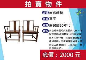 活動當天將由環保局徐世勲局長親自拍賣2件珍品(見附圖1、2),分別為太師椅,造型端莊大方,是中國傳統家具中最具代表性的座椅之一;以及收納大斗櫃,木質紋理細膩自然,色澤溫潤雅致,櫃體方正穩重,愛好古物的民眾,千萬別錯過!