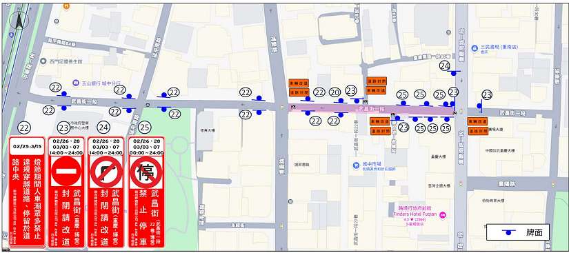 2、開幕日(2月26日)及假日16時至22時,漢中街(成都路至內江街)雙向、漢中街(內江街至長沙街)北向管制車輛通行。