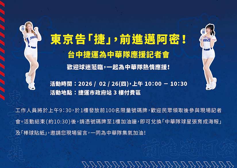 2026年世界棒球經典賽(WBC)開戰在即,台中捷運公司將於2月26日上午10點在中捷市政府站正式啟動「東京告『捷』,前進邁阿密!」系列應援活動,邀請球迷一起為中華隊集氣。當天前100位到場參加記者會並在加油留言牆寫下祝福的球迷,即可獲得中華隊球星張育成簽名海報,希望藉由大家的祝福,為中華隊注入滿滿能量。