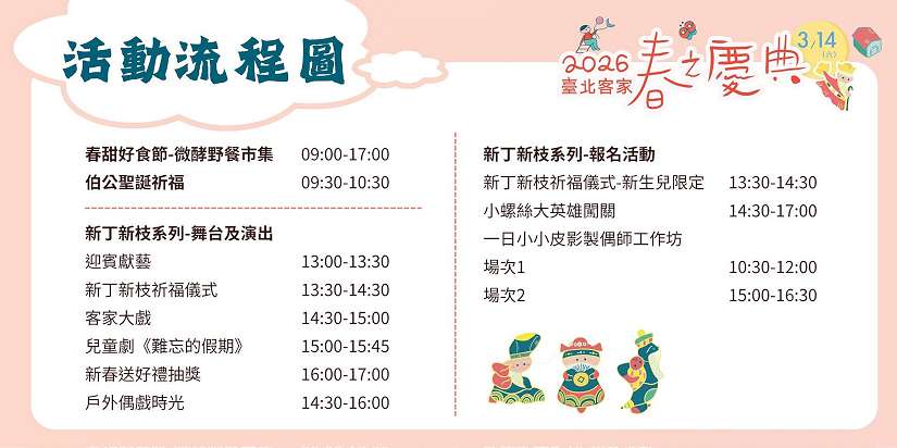 誠摯邀請市民朋友闔家參與「第五屆臺北客家春之慶典」,向平凡英雄致敬,共同感受客家文化的溫度與春天的新生希望。祈福儀式、親子闖關活動及DIY活動皆採事前報名,名額有限,報名連結如下: 「新丁新枝祈福儀式」:新生兒限定+祈福禮包