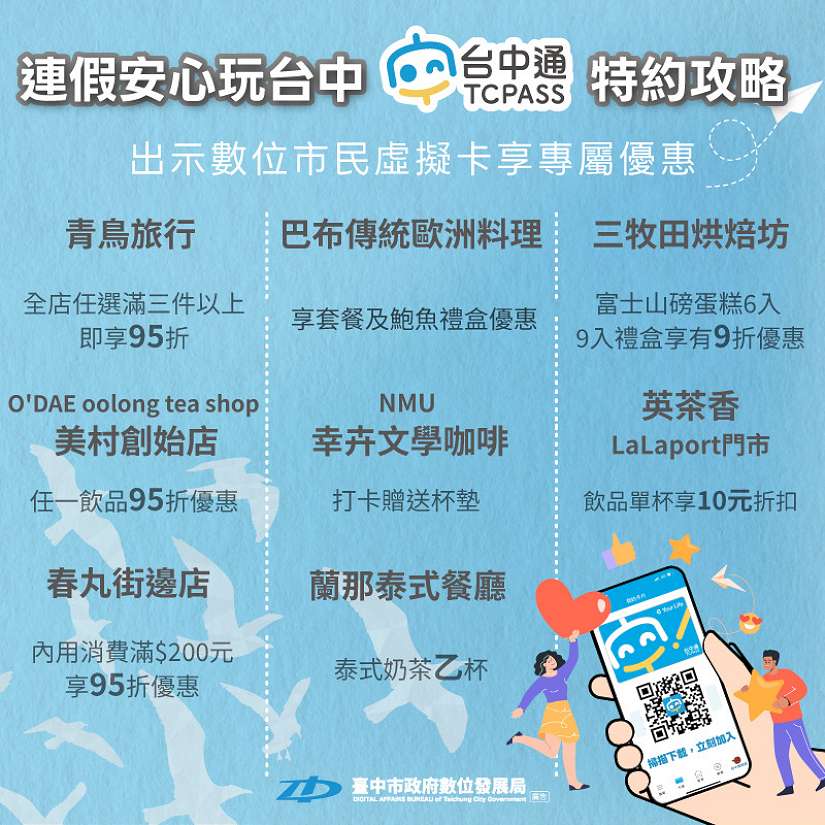 228連假即將到來,同時中台灣燈會「幸福蜜馬 台中MOOMIN ON!」展期已進入倒數最後一週!台中市政府數位發展局邀請全國民眾把握假期,來場台中城市輕旅行。為了讓民眾玩得盡興又省錢,數位局推薦出遊前先下載《台中通 TCPASS》APP,憑數位市民虛擬卡即可在超過1600家特約店家享有專屬優惠,從人氣伴手禮到在地美食應有盡有,讓連假行程更加精彩豐富。