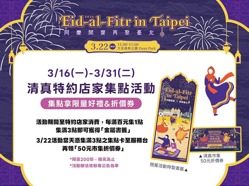 「2026 Eid-al-Fitr in Taipei同慶開齋 再聚臺北」即將在3月22日於大安森林公園熱鬧登場,臺北市政府觀光傳播局今年再度與多家清真餐廳和手作工坊合作推出「清真特約店家集點」活動,民眾於3月16日至31日期間到特約店家消費、完成集點任務,即可獲得限量特製「金屬書籤」,還能於活動當日至現場服務台兌換限量清真市集50元折價券。邀請市民朋友踴躍參與,搶先感受穆斯林文化與清真餐飲的異國魅力。