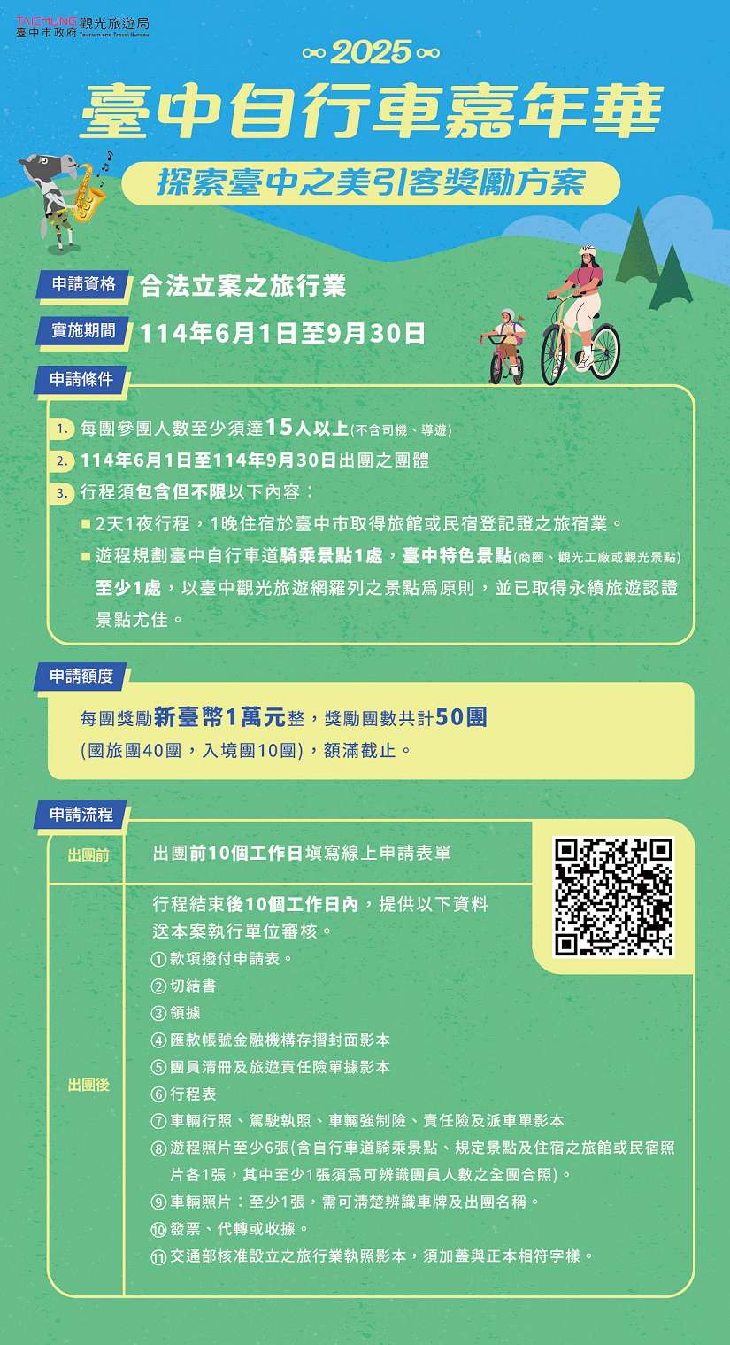 觀旅局補充,此次獎勵方案除期待透過各界創意規劃與實際操作,活絡在地觀光與促進自行車產業合作,同時亦為即將於8月2日登場的「2025台中自行車嘉年華」暖身,預告千人騎乘東豐、后豐綠廊盛況!此外,市府9月起亦將陸續舉辦一系列精彩活動,包括於大安媽祖文化園區登場的「2025台中國際糕豐會」、首度移師海線清水區舉辦的「2025台中國際踩舞嘉年華」;緊接著還有10月的「台中好湯溫泉季」、「台中爵士音樂節」及11月「台中國際花毯節」等活動,場場獨特又精彩,值得一來再來!