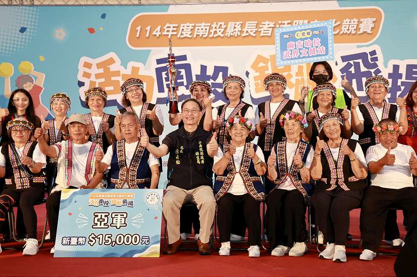 為打造長者展現健康活力與生命價值的舞臺,南投縣政府衛生局26日在南投縣農工商會展中心舉辦「活力南投 銀齡飛揚-長者活躍老化競賽」,共有來自全縣13鄉鎮市代表隊伍、439位銀髮舞者齊聚一堂同台競賽;縣長許淑華親自到場頒獎給15位超過90歲的長者,並披上「南投活力之星 銀齡寶貝」榮耀彩帶,肯定每位參與者的不老精神與熱情表演。