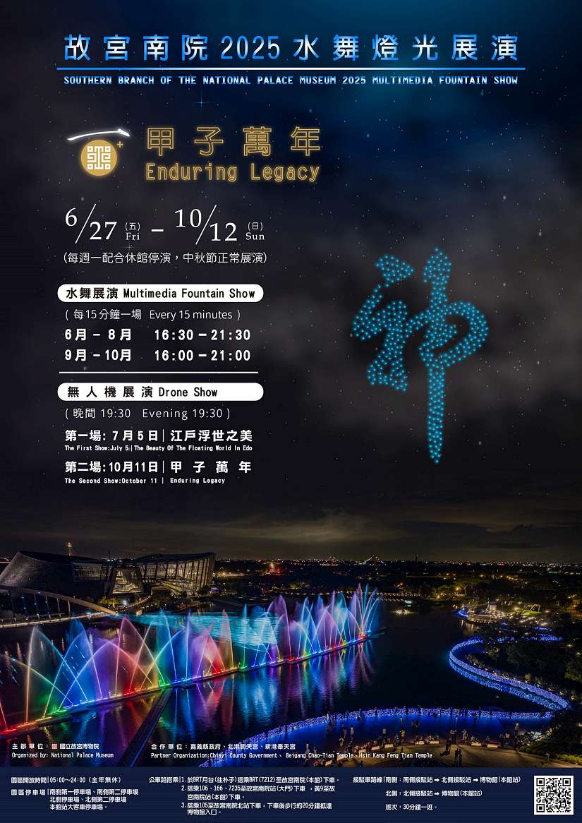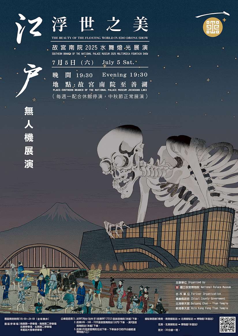 倍受矚目的還有7月5日無人機展演震撼登場。今年夏夜將召喚出歌川國芳經典浮世繪〈相馬的古內裡〉,巨大骷顱頭自南院建築之巔攀爬而上!還有人氣展件葛飾北齋〈神奈川沖浪裏〉的大浪、歌川國芳〈道行猫柳婬月影〉的役者繪貓咪,都將在夜空中震攝大家的雙眼。深受喜愛的王羲之〈平安何如奉橘三帖〉的平安、〈粉彩福祿壽葫蘆瓶〉的瓶身…等多種經典圖案也將閃耀升空。故宮南院表示,無人機展演以科技光影描繪故宮典藏的藝術精神與百年榮光,展現「以科技詮釋文化,以創新傳遞經典」的策展精神。