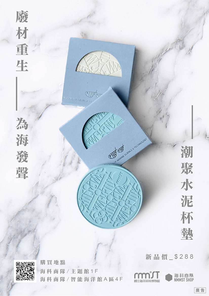 國立海洋科技博物館繼以環境和資源永續成功打造的文創商品「掃巴救星-擴香石」獲得肯定與商品迴響後,近期再度以創新文創及實踐永續海洋精神,特以廢棄建材回收再製的環保水泥,推出全新商品—「潮聚水泥杯墊」,這款吸水的水泥杯墊一推出即吸引許多關注和收藏者喜愛,不但具有日常生活實用價值,也能呼應環境永續和守護海洋的行動。
