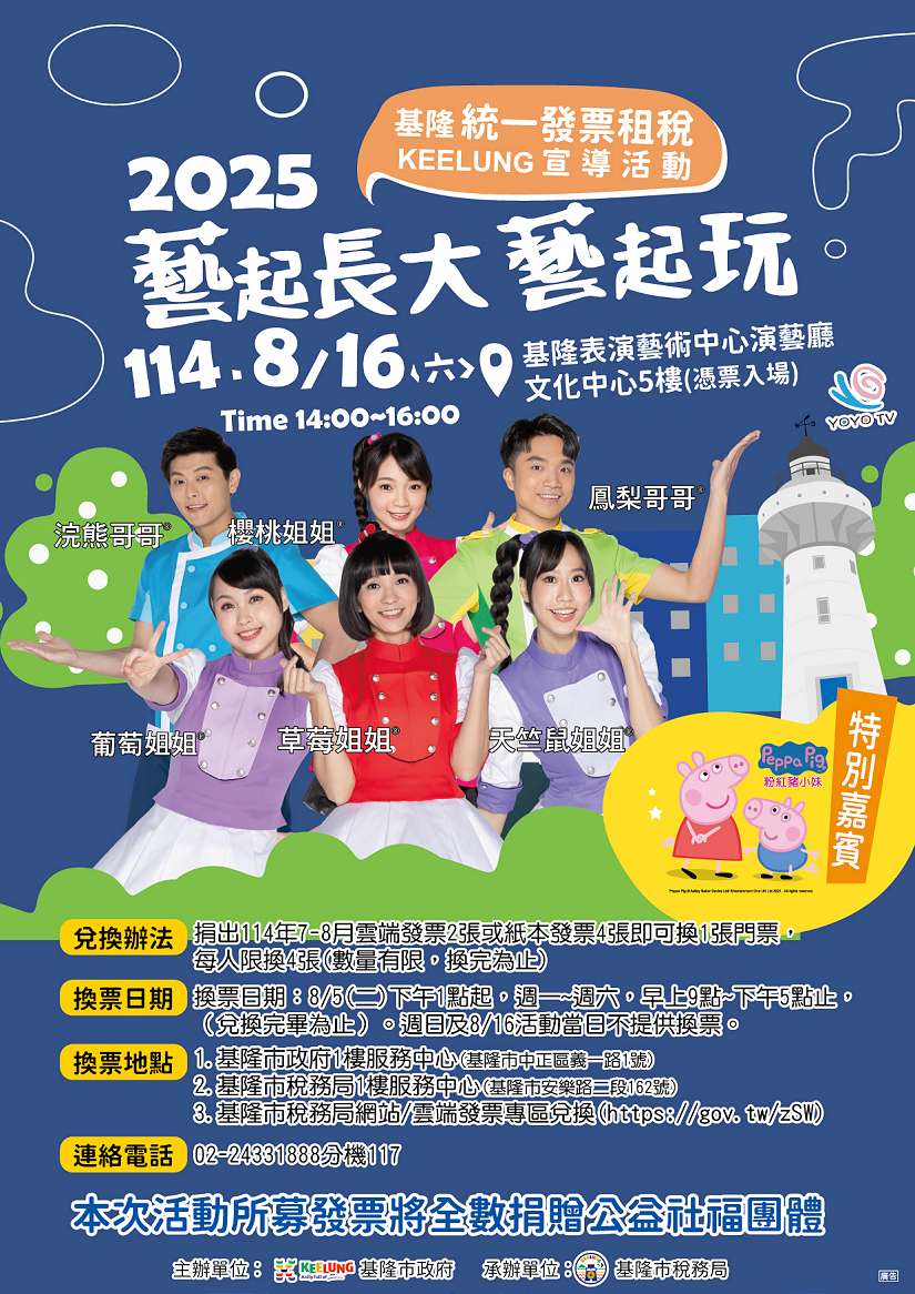 基隆市稅務局長歐秋霞補充,本活動採發票兌換入場券方式,每捐出114年7-8月紙本發票4張或雲端發票2張,可兌換入場券1張,每人限兌4張,數量有限,兌完為止;所有發票將全數捐予公益社福團體,歡迎市民一同做公益、享受親子時光。