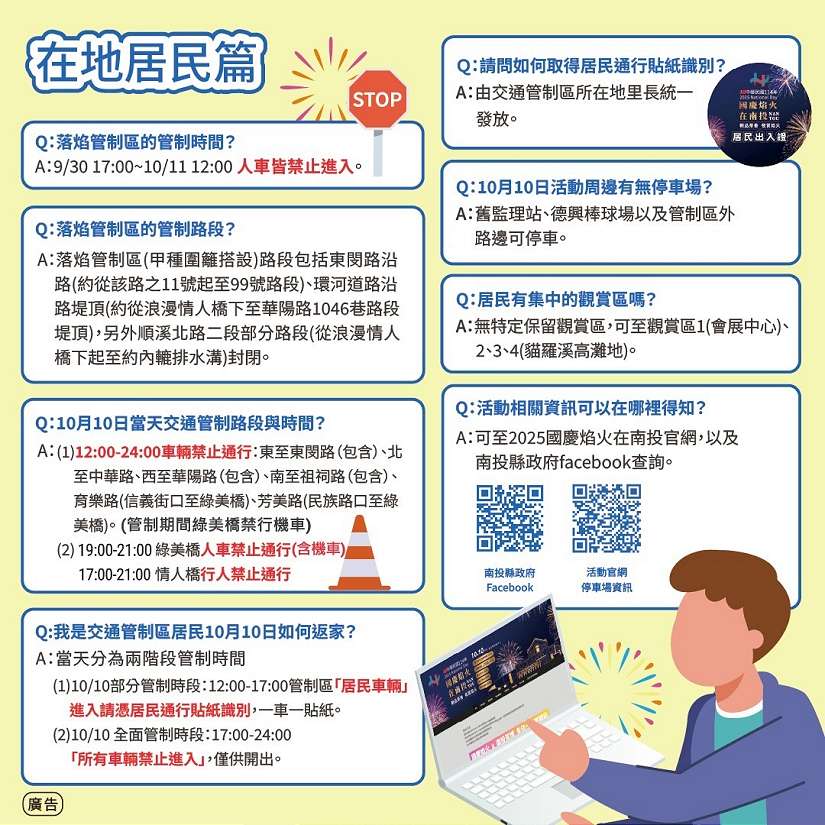 南投縣政府提醒,活動期間人潮眾多,請市民留意交通與安全管制,共同營造安全有序的觀賞環境。國慶當晚,除了40分鐘壯麗焰火,現場還有DJ混音焰火秀與壓軸演唱卡司,邀請大家一同見證南投夜空最閃耀的時刻。