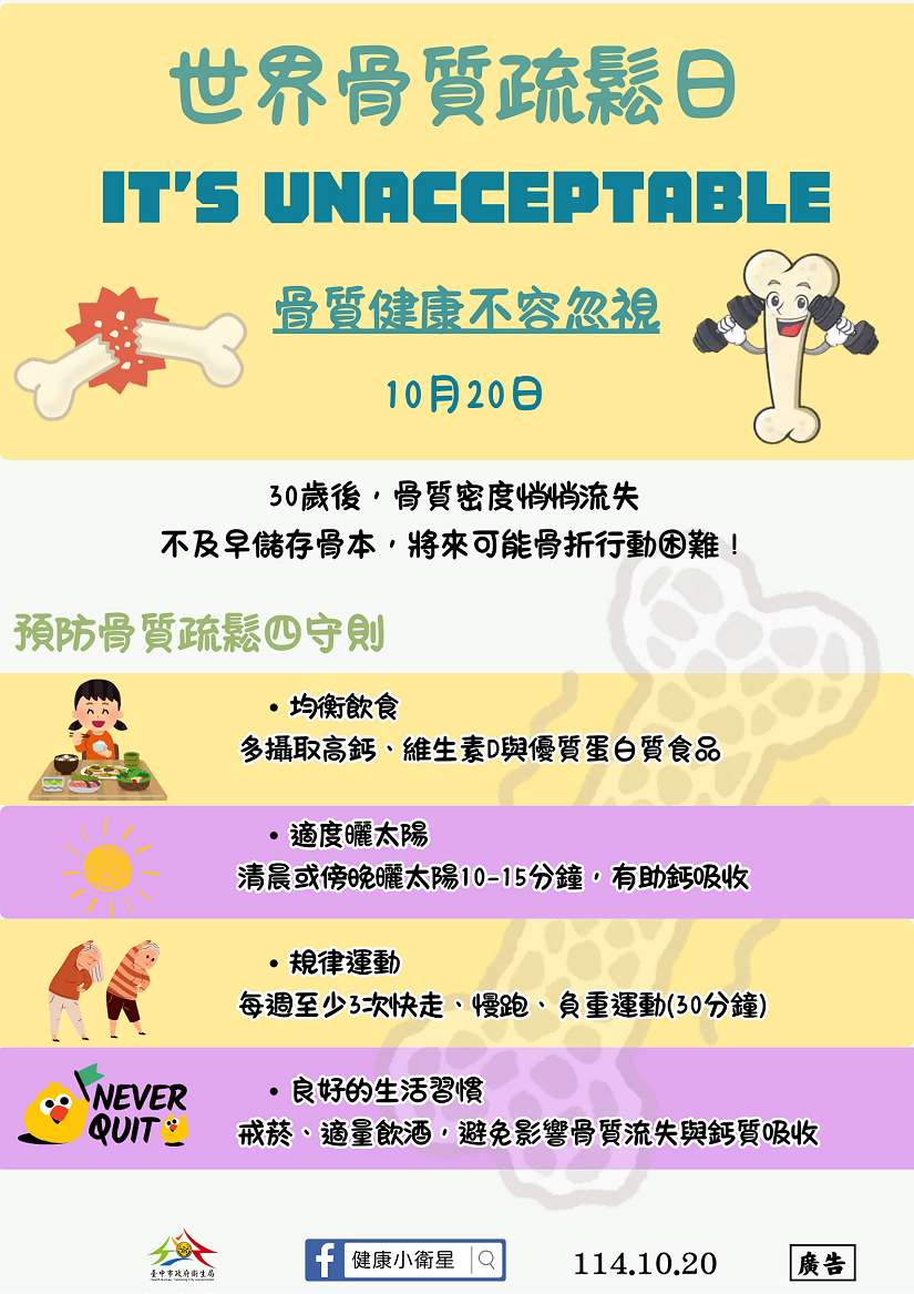 10月20日為世界衛生組織訂定的「世界骨質疏鬆日」,國際骨質疏鬆症基金會呼籲全球民眾「骨質健康不容忽視」,提醒應從日常生活中預防骨質疏鬆、守護骨骼健康。台中市政府衛生局長曾梓展也呼應此理念,分享「骨本四妙招」,包括均衡飲食、適度曬太陽、規律運動與養成良好生活習慣,鼓勵市民從年輕開始累積骨本,維持強健體態與行動力。