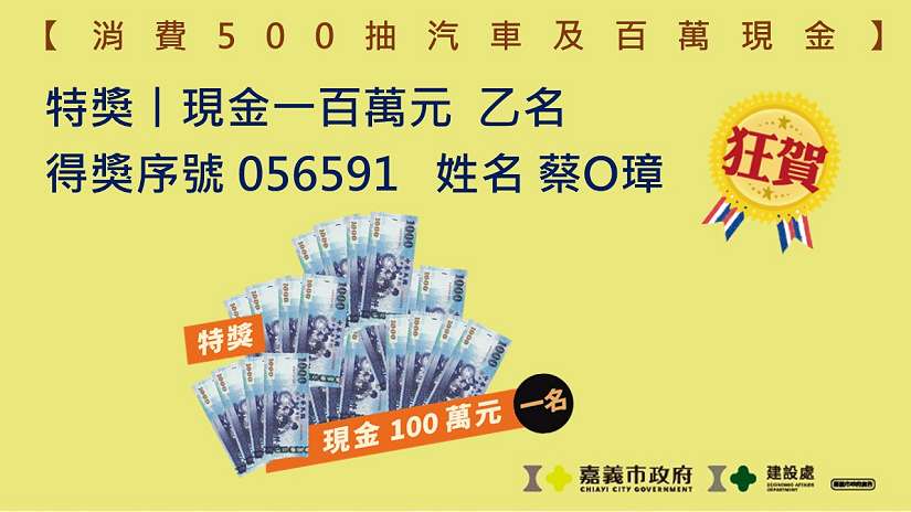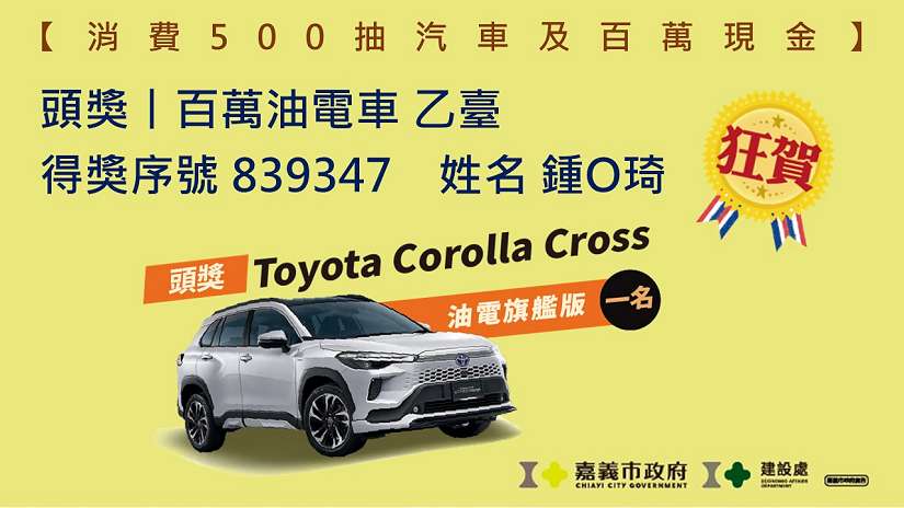 直播現場由陳永豐秘書長抽出頭獎Toyota Corolla Cross的百萬油電車乙名,得主為鍾O琦,序號為839347;特獎壹百萬現金乙名,得主為蔡O璋,序號為056591。並由嘉義市政府建設處長抽出電子支付專屬獎共10位得主,包含頭獎「iPhone17手機與AirPods第四代耳機 」乙名、貳獎「iPad Pro 256GB平板」乙名、參獎「現金16,800元」8名。另外也特別邀請今年發放嘉遊金成績奪冠的承億文旅桃城茶樣子品牌長簡巧珊,抽出今年新增的特約旅宿加碼獎「現金16,800元」1名,同場也公布「嘉購王」得獎主,累計登錄發票金額3,911萬8576元,共有98名民眾登錄金額都破百萬的成績,顯示嘉義市消費力不容小覷。