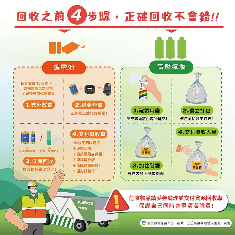 臺東縣環保局指出,行動電源、手機與筆電電池、卡式瓦斯罐、噴漆罐、打火機瓦斯罐等,若混入一般垃圾,經垃圾車壓縮或回收場高溫曝曬,極可能瞬間爆炸起火,危及清潔隊員與社區安全。若經勸導仍屢犯者,依據廢棄物清理法,可處新台幣1,200元以上至6,000元以下罰鍰,請民眾切勿任意丟棄。