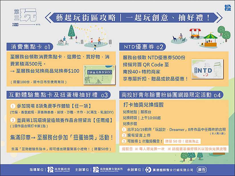 為激發青年創意能量,導入創新思維,翻轉地方景觀與活力,南投縣政府於114年舉辦「用青春玩創意」一系列活動,「第三玩.藝起玩街區」主題活動,將於10月25日(星期六)在南投市中興新村植物公園好玩登場,歡迎大家來玩。
