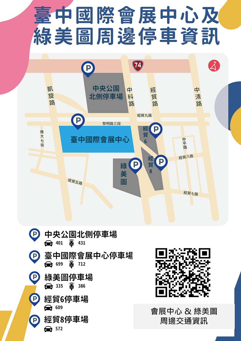 交通局補充,如果民眾自行開車前往,除停放台中綠美圖地下停車場,周邊停車場計有中央公園北側地下停車場、台中國際會展中心地下停車場、經貿6、經貿8等停車場,綠美圖試營運期間,共計有2,600席汽車停車位供使用。