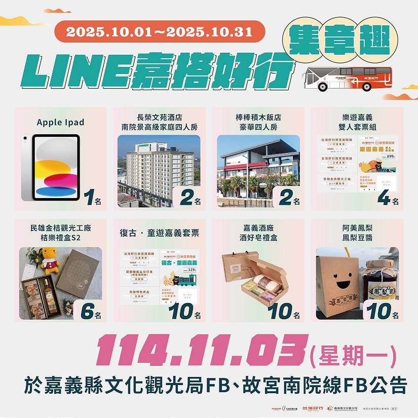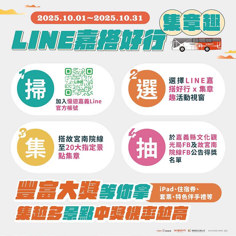 即日起至10月31日止,凡搭乘「台灣好行-故宮南院線」並完成「「LINE嘉搭好行 x 集章趣」集章活動,即有機會獲得iPad、住宿券、門票與在地伴手禮等豐富獎品,活動期間不定期推出搭車抽獎,更多即時資訊歡迎追蹤「台灣好行 故宮南院線」官方粉絲專頁,或加入「慢遊嘉義」LINE@(@chiayitravel)。