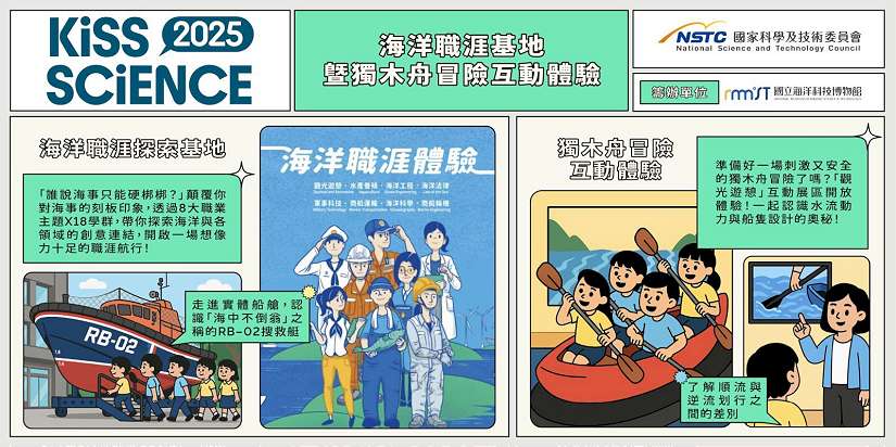 為響應國家科學及科技委員會「2025 Kiss Science—科學開門,青春不悶」活動,國立海洋科技博物館(海科館)將於11月8、9、15、16日連續兩個週末,特別推出「輕艇激流獨木舟冒險互動體驗」。海科館邀請民眾免費報名參與這項結合挑戰與探索的海洋活動,並採取預約報名制,引導民眾從興趣出發,發掘自身潛能與未來職涯方向。