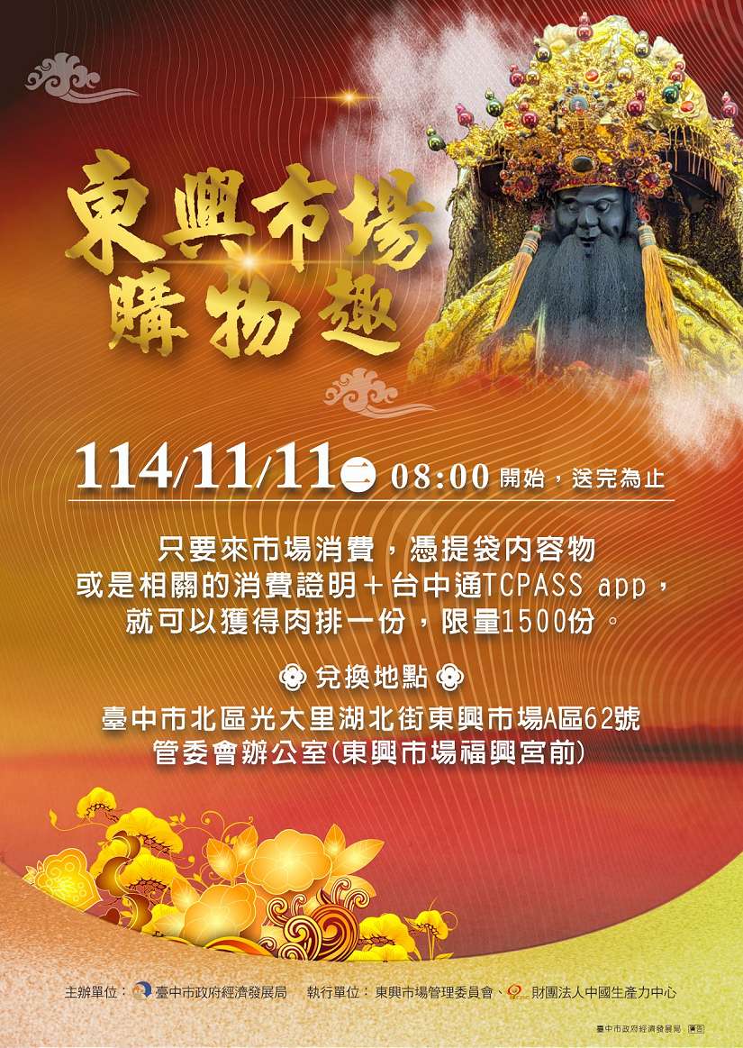 經發局補充,11月11日東興市場活動搭配傳統信仰文化。三國時代的「張飛」為台中市東興民有零售市場福興宮主祀神明,農曆9月辦理聖誕千秋大典,深受當地民眾重視,同時也是在地傳統信仰文化的展現與傳承。為了響應活動熱潮,市府與東興市場管理委員會攜手推出此次活動,歡迎大家一起熱鬧慶祝、體驗傳統信仰文化,再吃豬排迎好運。