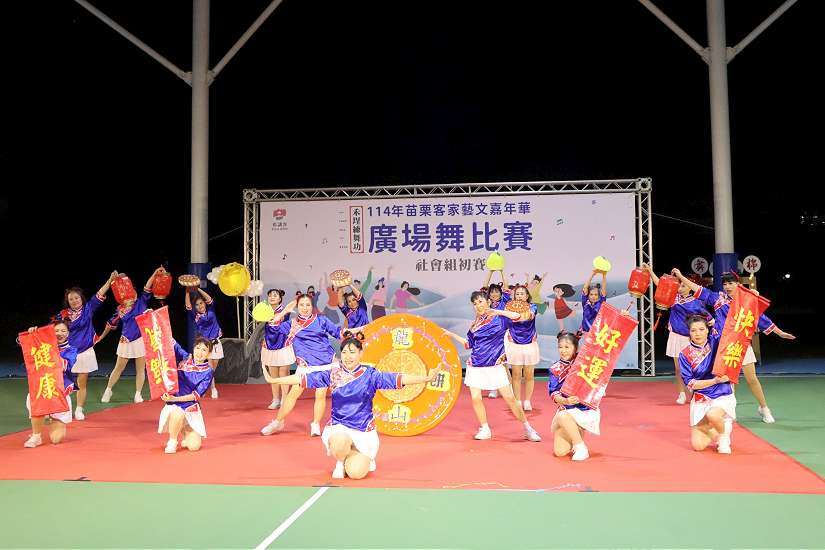 苗栗縣政府9日下午在竹南運動公園籃球場舉辦「114年客家藝文嘉年華—廣場舞比賽第二區社會組初賽」,活動以「舞動山城、傳承客情、歡笑苗栗、幸福共鳴」為主題,吸引竹南、後龍、造橋、通霄、西湖、銅鑼、三義及苑裡等地舞蹈團隊踴躍參與。