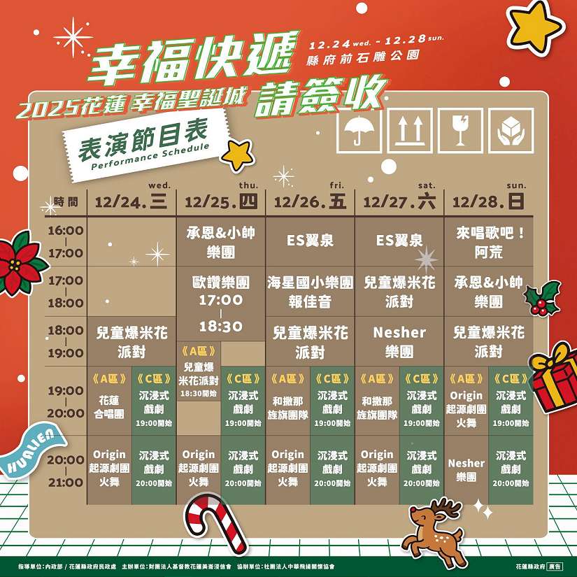 開城點燈儀式將由「美崙浸信會銀享家非洲鼓隊」熱力演出,12月25日另邀請 OmniPro Music(歐讚音樂)獻唱,以音樂傳遞溫暖與盼望。「幸福快遞」大型裝置藝術展期自12月17日至2026年1月1日;「叮咚!聖誕市集」於12月24日至12月28日,每日15時至21時舉行,地點在花蓮縣政府前石雕公園。