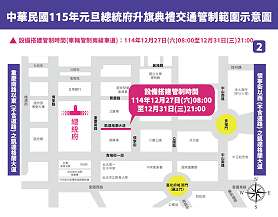 配合115年元旦總統府升旗典禮活動,總統府周邊區域自114年12月27日8時起,分階段實施設備搭建作業、升旗典禮預演、元旦升旗典禮等各項交通管制措施,請民眾注意交通管制訊息,並請配合改道。