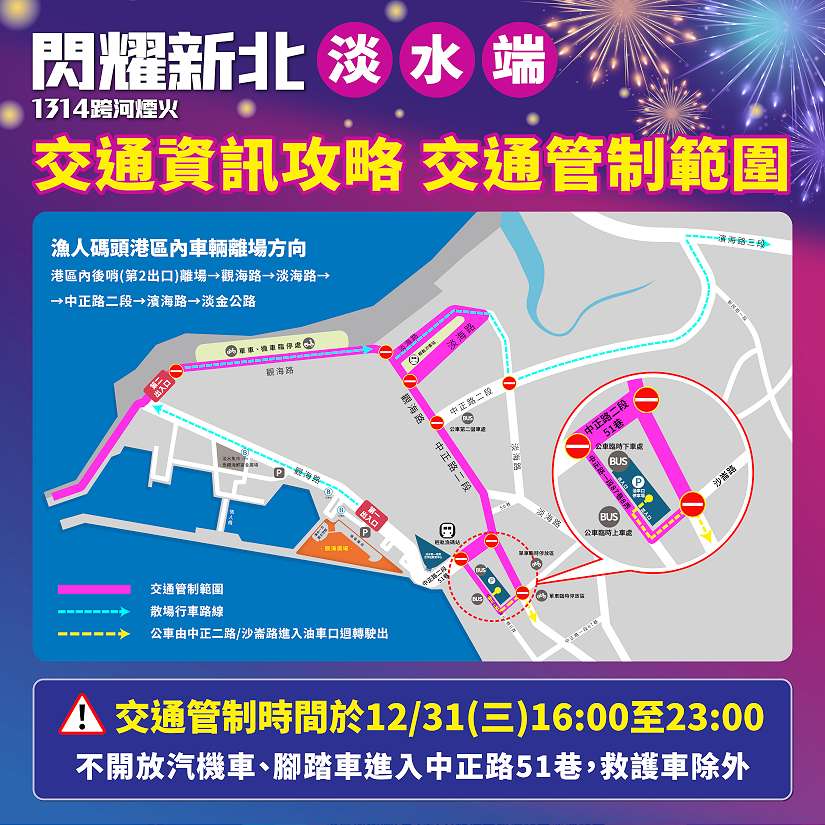 為確保活動順利進行,12月31日下午4點至晚間11點,淡水漁人碼頭及八里左岸周邊將分時、分區實施交通管制。淡水端中正路二段51巷將禁止汽、機車及自行車進入,並配合人潮狀況進行分流引導;八里端亦將視停車場容量與人流狀況,啟動道路封閉與車輛管制措施,請民眾配合現場警義交及工作人員指揮。