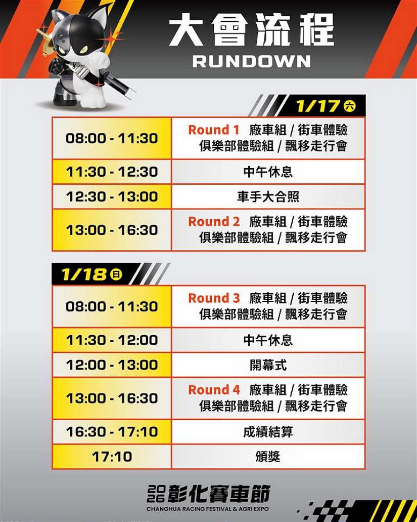 彰化不僅是農業重鎮,更擁有全台最完整的汽車零配件產業鏈。活動期間除精彩賽事外,現場也同步規劃汽車產業展示、市集活動及在地特色展區,結合觀光與休閒,適合親子、車迷與一般民眾共同參與。活動場域鄰近高鐵站,交通便利,建議民眾多加利用大眾運輸工具前往。