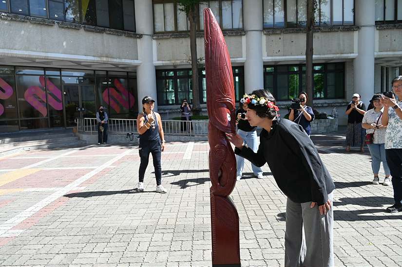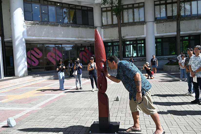 今天的活動先由臺東縣南島支架大洋州航海協會理事長江伊茉說明星空羅盤「Pou Haere」的文化背景與象徵意義,並由 Eruera進行吟唱與祝禱祈福,隨後以毛利傳統「hongi 碰鼻禮」完成祝禱。Eruera亦邀請縣長共同進行「碰鼻禮」,象徵尊重、友誼與文化的連結,並表達對南島文化交流的肯定與祝福。江伊茉說,臺東活水湖於10月4日啟動全臺首座星空羅盤雕刻柱,「Pou Haere」源自毛利語,其中「Pou」意指「柱子」,「Haere」則為「行走、旅程」之意。此次由毛利雕刻工藝師於公東高工製作完成的星空羅盤雕刻柱,象徵航海智慧與星辰指引,承載南島民族跨越海洋、延續知識與文化的深厚意涵。