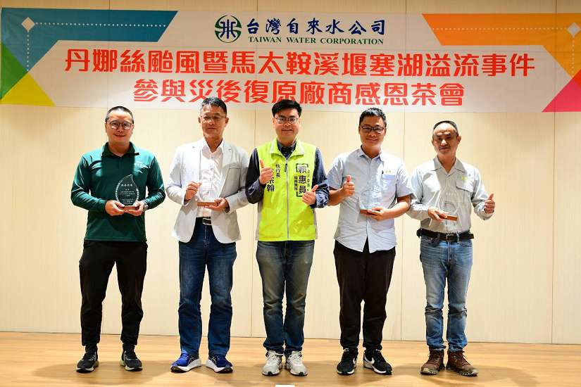 台灣自來水公司(23)日舉行災後復原協力廠商表揚典禮,公開表揚在丹娜絲颱風台南風災屋頂修繕協力廠商及花蓮縣馬太鞍溪堰塞湖溢流事件協助復水廠商,積極投入災後復原作業,肯定其貢獻與專業投入。