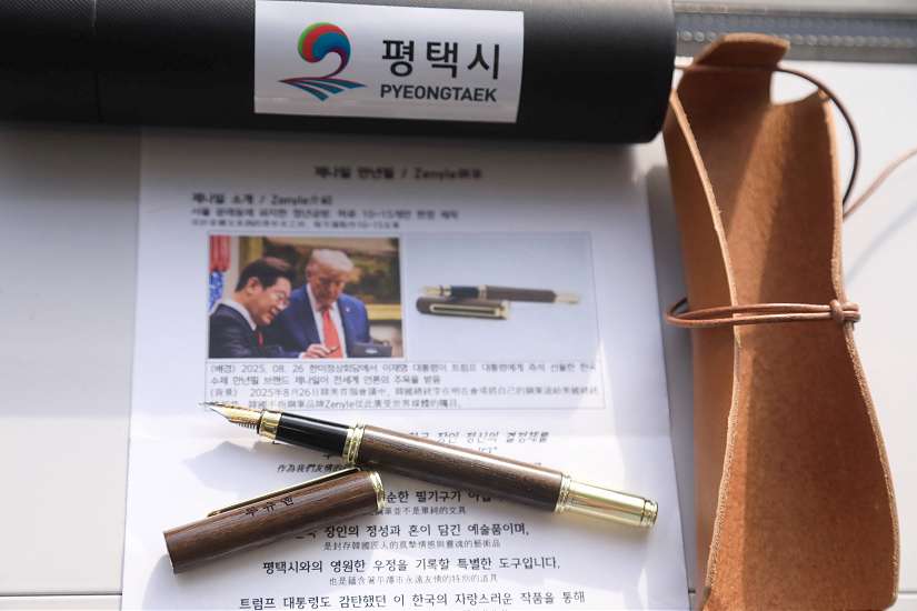與南韓總統李在明去年8月贈送給美國川普總統的同款鋼筆-木質筆身上方特別刻有盧秀燕市長的韓文-圖/台中市政府提供