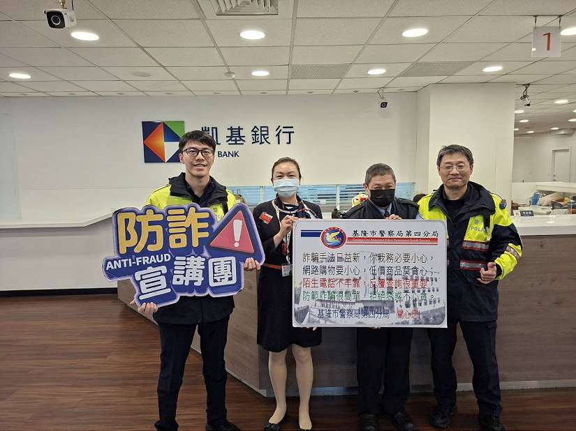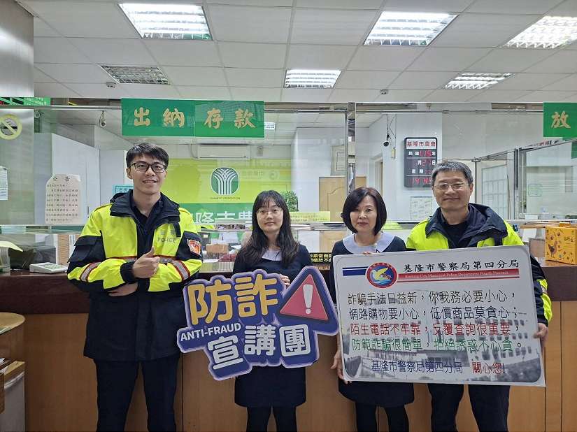 為強化轄內金融機構防詐能量,提升民眾財產安全意識,基隆市警察局第四分局安樂派出所於115年1月27日14時許,由所長陳品碩率同巡佐韓明芝及警員陳君瑋,主動走訪轄內金融機構進行反詐騙宣導,落實警銀合作機制,共同防堵詐騙案件發生。