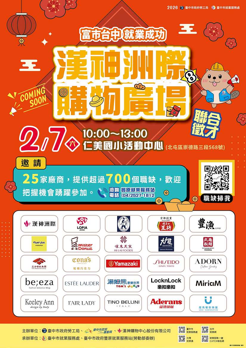 為協助北屯區「漢神洲際購物廣場」開幕營運順利銜接人力需求,台中市政府勞工局、運動局攜手漢神購物中心,將於2月7日(星期六)上午10時至下午1時,在北屯區仁美國小活動中心(北屯區崇德路三段568號)舉辦聯合徵才活動。此次集結25家進駐品牌,釋出超過700個工作機會,其中台灣松本清藥師職缺月薪最高上看7萬3,000元,提供求職民眾與青年學子進入指標商場就業的絕佳機會。