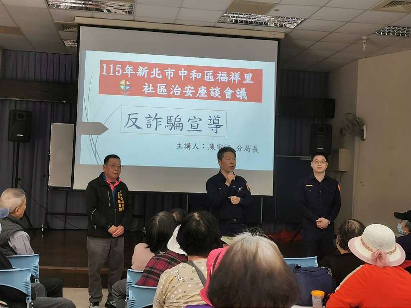 中和警分局犯罪預防團隊(20)日由分局長陳宇桓親自帶領,結合轄內福祥里辦理銀髮族共餐活動,向里民宣導常見詐騙手法,並提醒長輩們「不輕信、不匯款、多查證」。