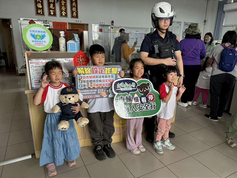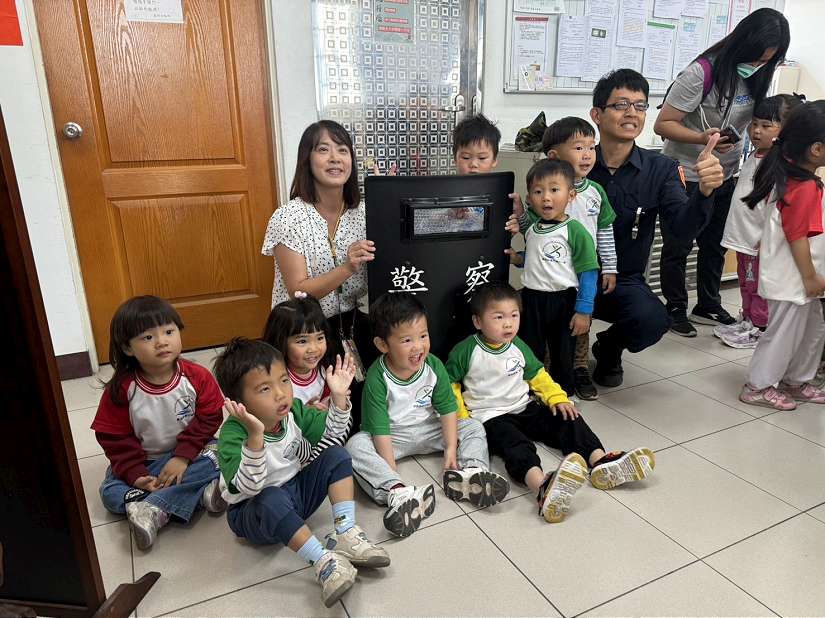 活動由蔡季龍、余育財2位所長親自解說,深入淺出地介紹警察勤務與為民服務,並針對反詐騙、交通安全及婦幼保護進行專題宣導,將生硬的法律知識轉化為活潑互動,引導學童建立正確的安全預防觀念。現場更展示警棍、防彈衣及酒精測試器等裝備,讓孩子們親自穿戴體驗,看著「小小波麗士」認真操作器材的模樣,氣氛熱烈且充滿歡笑。