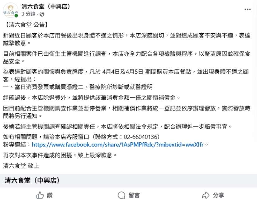 有關新店區「清六食堂」疑似食物中毒事件,通報就醫人數已逾百人。新北市政府消費者保護官昨日下午進行第一次行政調查,除要求業者落實補償方案外,並釐清相關保險理賠分工,確保無論內用或外帶之受害消費者均能獲得保障。