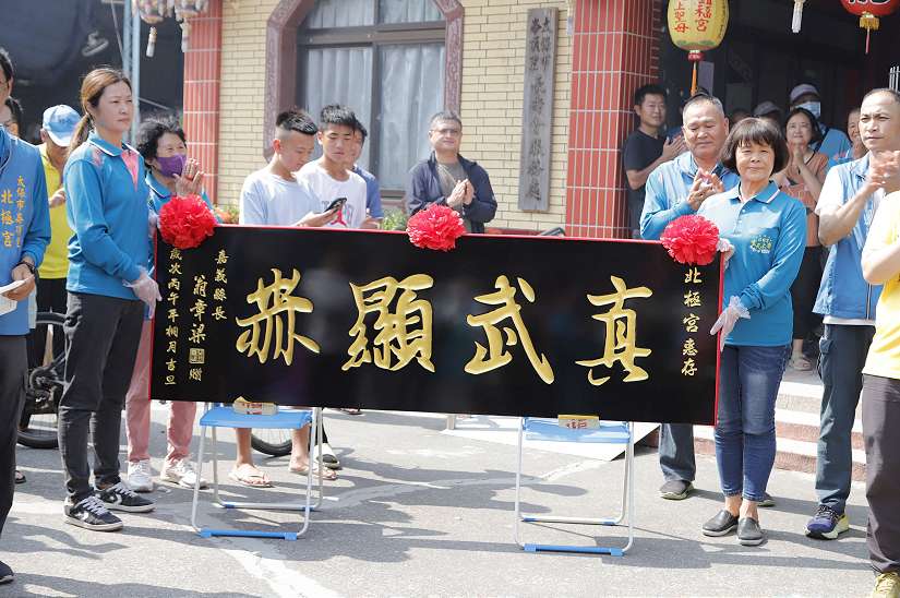 嘉義縣長翁章梁19日出席太保市北極宮玄天上帝聖誕暨贈匾儀式,入廟團拜並贈匾題字「真武顯赫」,農曆三月初三玄天上帝聖誕,翁章梁說這塊匾額能選在今天放在宮內,是他很大的福氣。
