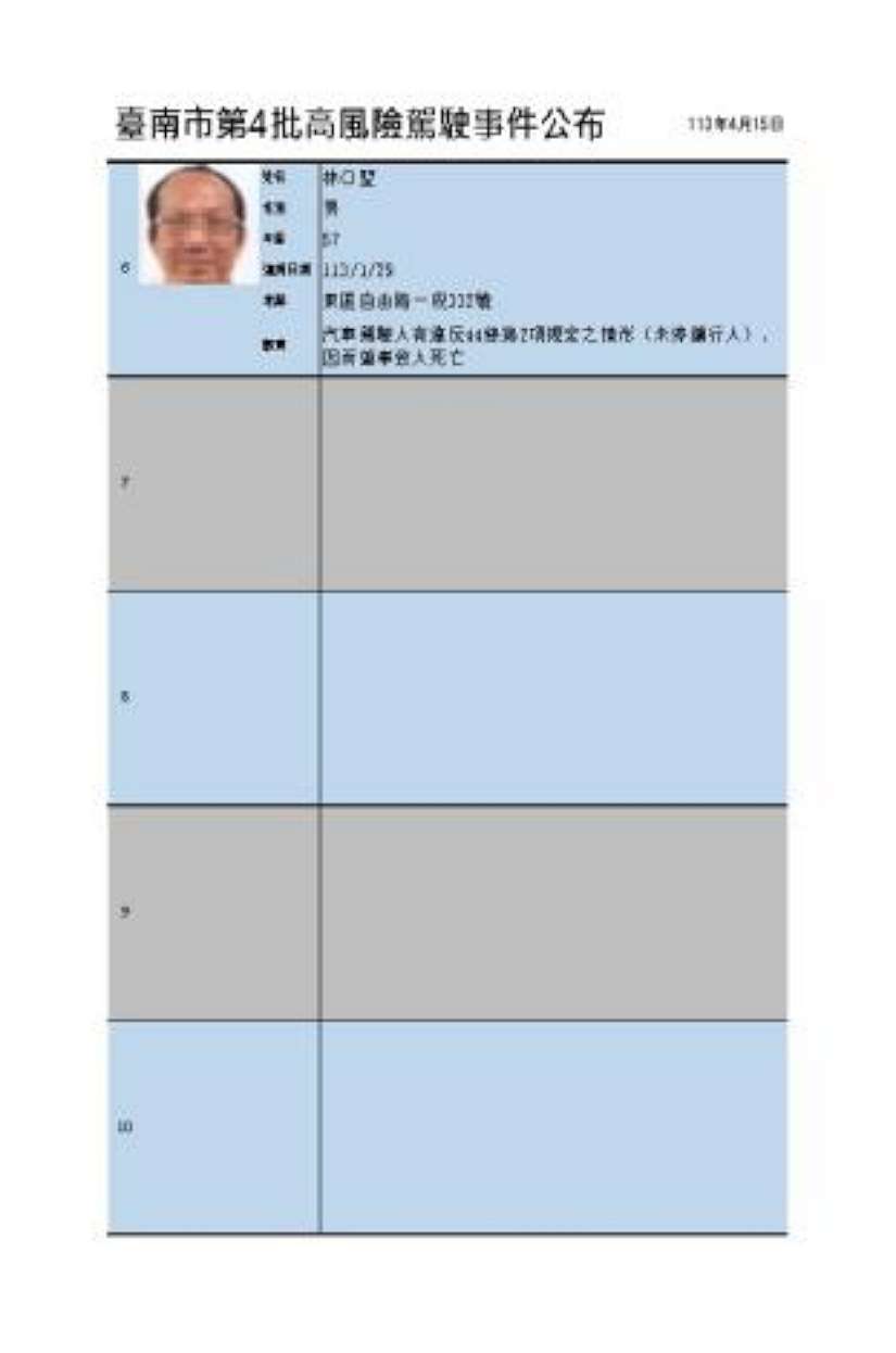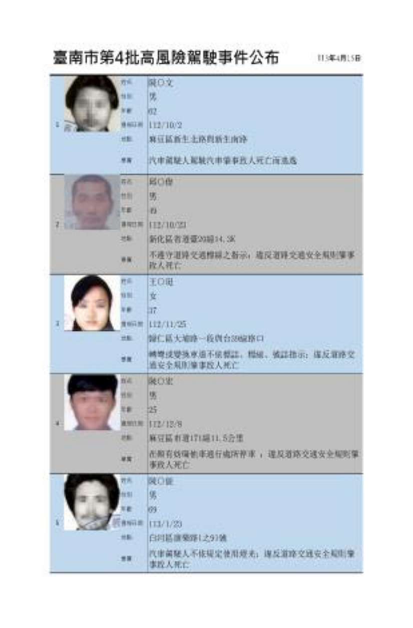 交通局表示,去(112)年8月11日公告施行台南市高風險駕駛事件資訊公開作業原則,主動公開高風險駕駛事件資訊。當事人違反道路交通管理處罰條例,且肇事致人重傷或死亡之駕駛行為為公布對象。第1-3波已公布7人,此次第4波共公布6人,因當事人涉及交通違規肇事致人死亡,於裁決處分完成後,將相關資訊以去識別化公布於交通局網站「高風險駕駛事件公布專區」。