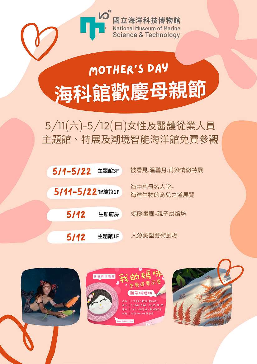 5月是康乃馨的季節,而5月的第二個星期天也是母親節。國立海洋科技博物館為感念全天下母親的偉大,特別本周假日(113年5月11日至5月12日)提供所有女性及醫護從業人員免費參觀海科館主題館、特展及潮境智能海洋館優惠。同時海科館文創精品也特別於5月份提供「媽媽的少女時代」活動,只要購買珊瑚絲巾就贈送珊瑚抱枕及不織布提袋,一起歡度5月感恩的季節。