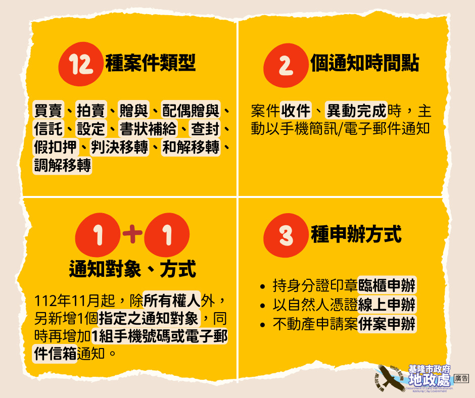 「地籍異動即時通」如何申辦?通知的案件類型?通知時間點及對象為何?基隆市政府地政處製作1款宣導圖卡,歡迎市民朋友多加利用!