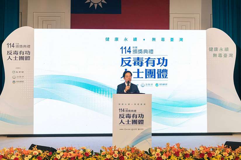 為表彰毒品防制工作表現卓越的個人與團體, 114年「反毒有功人士團體頒獎典禮」昨(24)日在國家圖書館舉行,賴清德總統及行政院卓榮泰院長蒞臨現場頒獎。今年頒獎典禮由教育部主辦,本屆以「健康永續.無毒臺灣」為主題,象徵政府致力推動無毒社會、守護國人健康的決心。本次典禮共頒發26位(組)有功人士與團體,現場200餘位來賓共襄盛舉,一同見證得獎者的成果與榮耀。