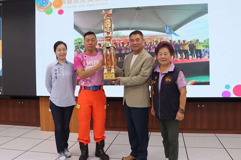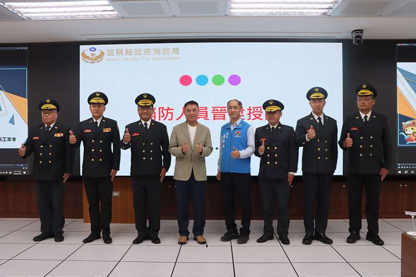 苗栗縣政府消防局於24日上午舉行消防人員晉陞授階、各項工作獎勵金頒發、表揚十大傑出救護技術員以及「消防人員工作安全作業輔助團」啟動儀式,縣長鍾東錦親自勉勵所有消防弟兄姊妹持續精進專業、守護鄉親安全,他表示,消防人員的工作無分晝夜、24小時輪班,付出無怨無悔,無論是基層同仁還是領導幹部,唯有團結協作、互信互助,才能建立一個更融洽且高效的工作環境,相信在匡局長與幕僚團隊的堅強領導下,消防局未來將持續精進,成為苗栗縣民安居樂業最堅實的後盾。