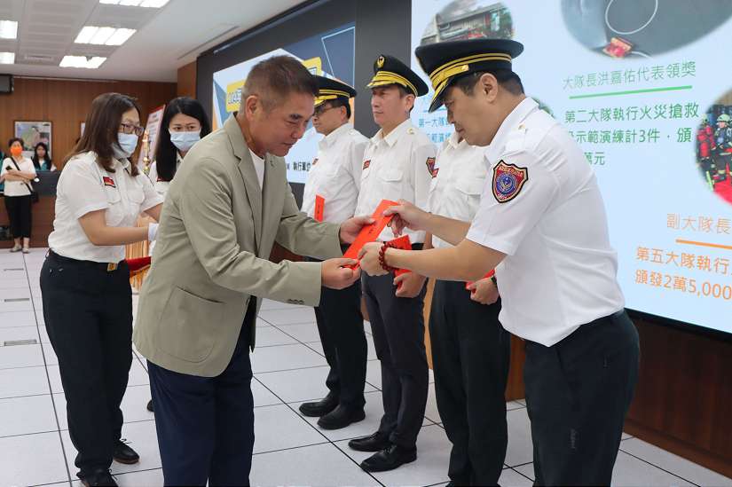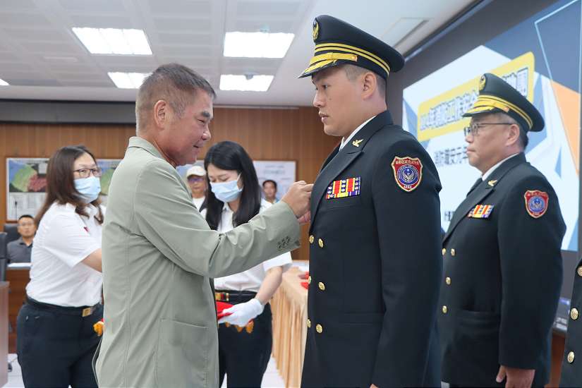 昨日舉行授階特晉陞副大隊長羅政銘為科長、分隊長林崇浩為副大隊長,另有四位表現傑出之同仁晉陞為科員,合計六位晉陞人員皆具豐富消防實務經驗,工作態度積極認真,堪為楷模;同時,為肯定消防人員於災害搶救、團隊合作及推動職場安全等面向的卓越貢獻,縣府頒發總額逾新台幣四十一萬七千元之獎勵金,包括端午節龍舟賽五連霸選手獎勵一萬元、災害搶救勤務十二案計二十萬五千元、救護勤務十二案計五萬四千元,以及業務績優單位獎勵十四萬元,以茲鼓舞。此外,第五大隊小隊長杜泳霖更獲選為2025年度「十大傑出救護技術員」,此一殊榮經台灣急診醫學會嚴謹甄選,展現苗栗縣消防局於急救專業領域的傑出實力與領導地位。
