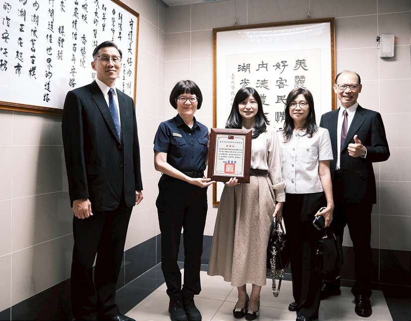 勇源基金會董事林安宙代表捐贈止血帶訓練設備與蕭惠珠分局長合影-圖/內湖分局提供
