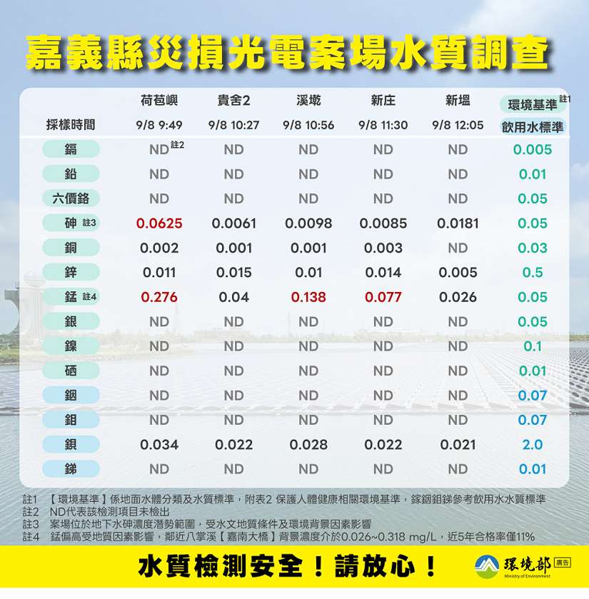 自丹娜絲颱風造成嘉義地區光電案場受損,環境部持續會同地方進行水質抽驗,以釐清受損光電板浸泡可能導致重金屬溶出污染風險。繼7月14日、28日及8月11日、25日4次抽驗後,9月8日再進行第5次抽驗,檢測鎘、鉛、六價鉻、砷、銅、鋅、錳、銀、鎳、硒及銦、鉬、鋇、銻14項重金屬。