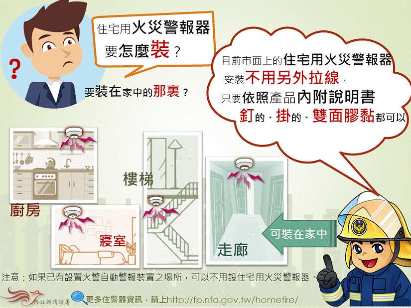 目前市面上的住宅用火災警報器安裝簡便,無需外拉電線,只要依照產品說明書以釘、掛或雙面膠固定即可,建議安裝於臥室、走廊、 樓梯、廚房等處,全面提升火災防護。