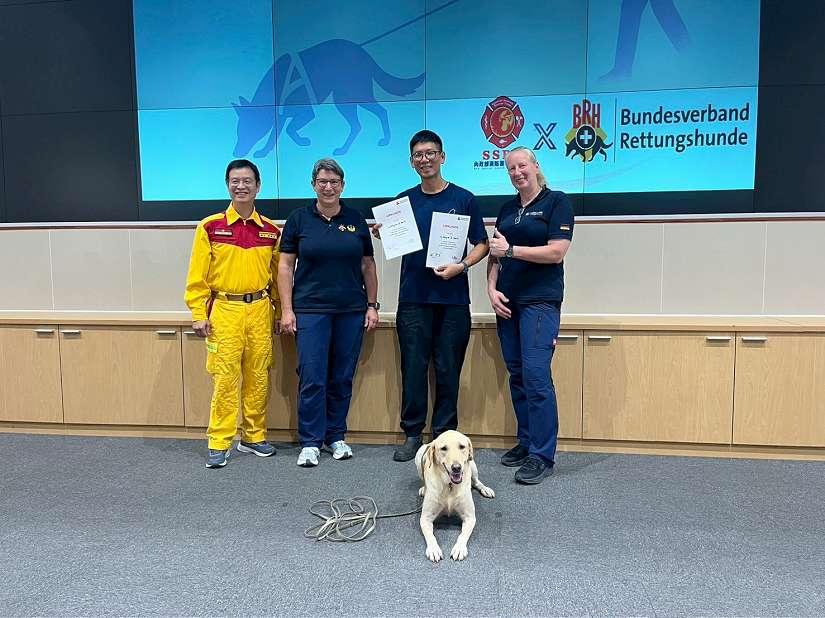 內政部消防署特種搜救隊日前舉辦BRH(Bundesverband Rettungshunde,德國聯邦救難犬協會)共同訓練課程及認證測驗,桃園市政府消防局搜救犬小組傳來捷報!領犬員盧弘恩與搜救犬APRIL順利通過「路徑追蹤高級認證」,成為全台第一隻取得該項國際專業認證的搜救犬,為我國搜救能量再添新戰力。